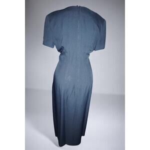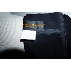 Step into timeless elegance with this vintage Anna Ricco New York black midi dress. Featuring a flattering hourglass silhouette, a dramatic front keyhole detail, and a full covered button-down front, this dress blends minimalist 80s sophistication with modern edge. Padded shoulders and a back zip add structure, while the midi length and sleek black crepe elevate the look for formal or evening occasions.