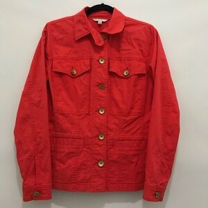 Stylish Red Utility Jacket. Features button front and ruffled back. Perfect for casual wear.