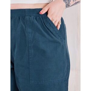 Big Bud Press Action Pants in a deep teal blue hue. These versatile trousers are crafted from durable 100% cotton twill and feature a comfortable high-rise elastic waistband. Designed with a wide-leg silhouette and functional workwear-inspired details, they include large front patch pockets and rear pockets for a practical yet stylish aesthetic. Made in Los Angeles, these pants offer a relaxed fit perfect for everyday wear.