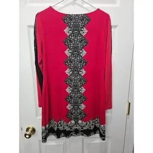 Chic Y2K-inspired Style & Co tunic dress in a bold red and black medallion print. Features sheer black lace inset sleeves and a soft stretch fabric for a flattering, comfortable fit. Can be worn as a mini dress or long tunic with leggings.