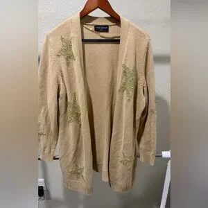Chic tan cardigan adorned with shimmering star details. Perfect for layering and adding flair.