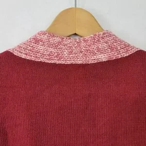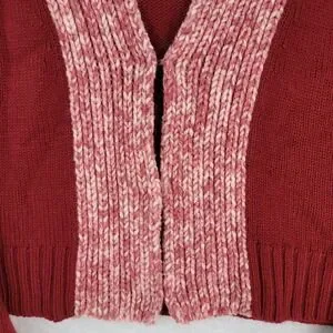 This vintage women's cardigan by To The Max boasts a vibrant red hue accented by a subtly contrasting pink marled trim. Meticulously crafted from a blend of 89% acrylic and 11% wool, it feels soft yet offers durability and warmth, making it an excellent wardrobe staple for cooler weather. The open-front design with a hook closure at the base of the V-neckline lends a versatile and chic touch to pairing this piece with a range of outfits. Measuring approximately 16.5 inches in length from top to hem and 18 inches from pit to pit, this medium-size sweater boasts a flattering fit for a variety of body shapes. While this pre-owned cardigan is in good overall condition, please note a minor flaw: threads are coming undone along one of the hooks in the front (see photos for detail). Care instructions are dry clean only to maintain its integrity.