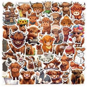 56 Adorable highland cow stickers in various designs. Perfect for decorating laptops, notebooks, and more. Features vibrant colors and charming illustrations.