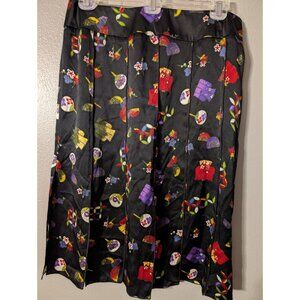 The print is a vibrant, maximalist "Japonisme" novelty design, showcasing intricate kimono robes and traditional folding fans against a crisp black backdrop. Because it is constructed from 100% heavy-weight silk, the panels give the skirt a beautiful weight and movement that you just don't find in modern fast-fashion.