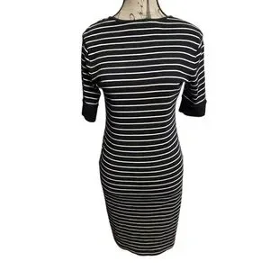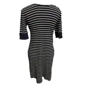 Elegant midi dress with navy and white stripes. Features short sleeves and a flattering fit. Perfect for any occasion. SKU 780