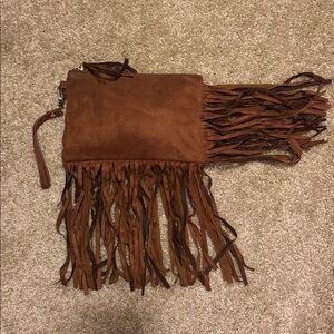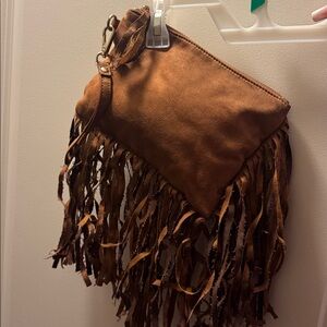 Stylish brown clutch with fringe detailing. Perfect for adding a boho touch to any outfit. Great for a Rodeo