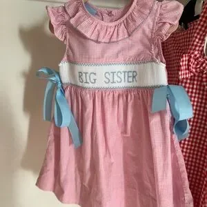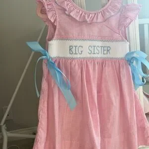 Adorable pink gingham dress featuring 'Big Sister' embroidery. Perfect for casual outings, this dress includes charming blue ribbon accents. Worn once for a photo like new