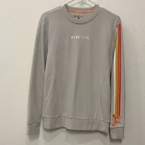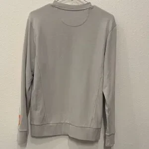 Gray sweatshirt with bold orange branding. Comfortable and stylish.