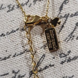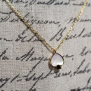 Kate Spade Signture Spade Pendant Necklace Gold Inlaid With Mother Of Pearl. Necklace measures about 16" with a 3" additional extender chain. Lobster claw clasp with Kate Spad New York tag and spade charm. Matching Earrings are also listed.