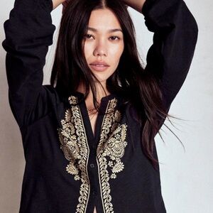 Stylish navy blouse featuring detailed cream embroidery. Ideal for versatile wear.