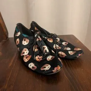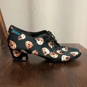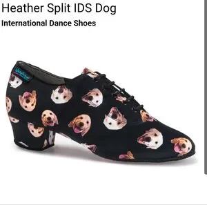 Heather Split Sole ballroom practice/teaching shoes by IDS (International Dance Shoes). UK size 5 UK (approximately US size 7). 1.5-inch cuban heel. Satin upper (limited edition dog print) and suede soles in good used condition.