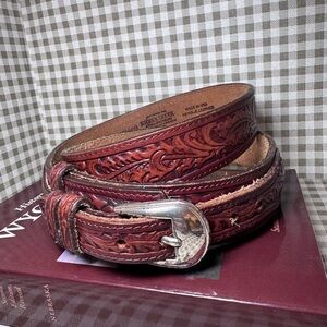 Enhance your wardrobe with this vintage style embossed leather belt. The rich burgundy color adds a classic touch to any outfit. Made in the USA