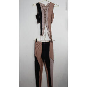 Brown and tan grunge, wasteland, Y2K style two piece, tank and bottom set. Chocolate brown, tan and black patchwork panels all over top and bottoms. Lettuce edge detail and raw seams. Sexy lace up front top with asymmetrical panels in the front. Bottoms are high wasted and sexy, fitted throughout leggings. Material is soft, stretchy ribbed knit material that is on the tinner side. Size medium. top approx 13 inches pit to pit and approx 12.5 inches long, bottoms approx 12.4 inches and 37.5 inches long.