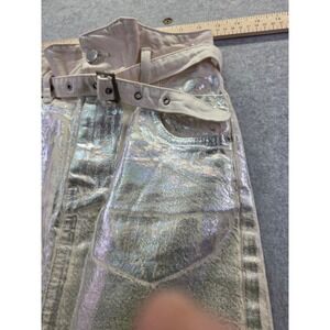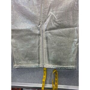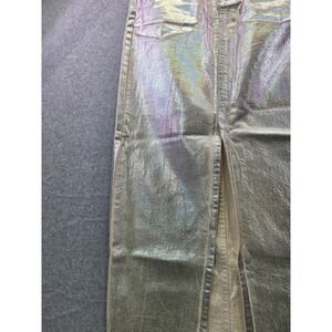 Zara denim maxi skirt features a striking silver metallic holographic foil finish over an ecru-colored base. Designed with a high-waist silhouette, it includes a matching removable belt with grommet details and a classic five-pocket construction. A deep front slit adds movement to the long-line design, while the iridescent coating provides a futuristic, high-fashion aesthetic.