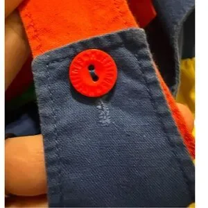 Adorable vintage Mufflings by Schwab baby bubble romper in size 12 months. Features bold primary colorblock panels in red, yellow, navy, and green with shoulder button closures and snap bottom for easy changes.