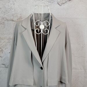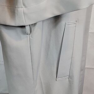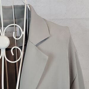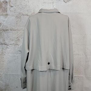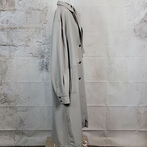 This elegant gray trenchcoat by Lattelier offers a sophisticated look with a notched collar, shoulder cape, and standing collar option. Beautiful and in great pre-owned condition but is missing belt.