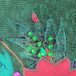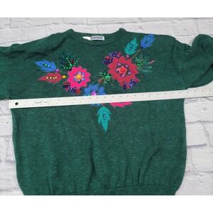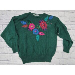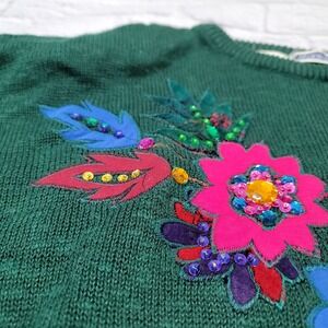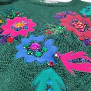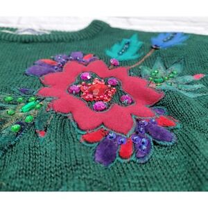 Vintage Mariea Kim sz Large Green Knit Sweater Beaded Embellished Flowers Korea