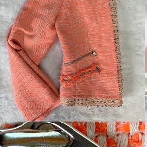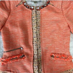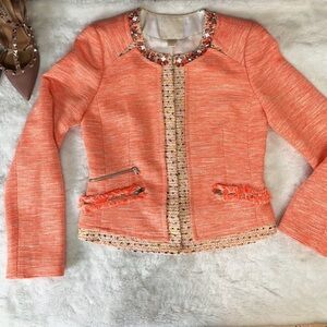 Chic coral blazer with textured fabric. Features elegant trim and tailored fit. Ideal for stylish occasions.