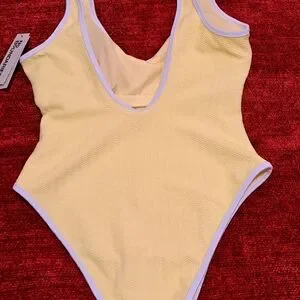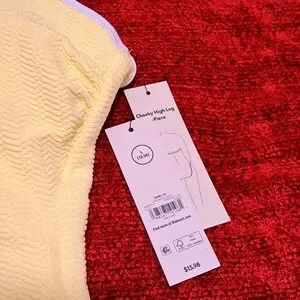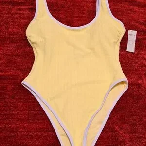 Chic lemon swimsuit with a textured design. Features a high-leg cut.