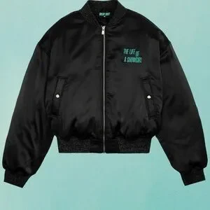 Stylish black bomber jacket featuring embroidered text. Perfect for casual wear.