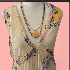 Free People sleeveless floral dress in a soft blush-peach tone (photographs slightly more yellow). Lightweight, flowy fabric with delicate floral print and a feminine ruffle hem. Relaxed boho silhouette with deep armholes and a flattering drape.