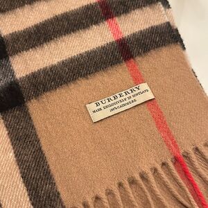 Elegant Burberry scarf with iconic plaid design. Features beige, black, white, and red tones.