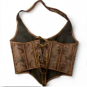 This elegant brown paisley halter top corset is perfect for adding a touch of sophistication to your wardrobe. The intricate design and rich color make it a standout piece for any occasion.