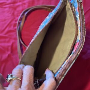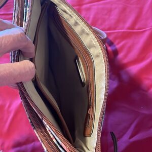 Gorgeous! This soft, faux leather bag has six storage compartments. This mail bag style is perfect for all the running around a busy woman does! Two of the compartments have zip top and there is a center compartment that has a magnetic snap. Adjustable shoulder strap. Measurements 8 1/2”x10”x1”