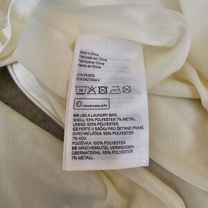 Cute dress with a silver metallic threaded throughout to give it a nice sheen. It has a deep v in front and a backless effect with side cutouts. The bust measures 18" flat, waist is 14" flat and the overall length is 36".