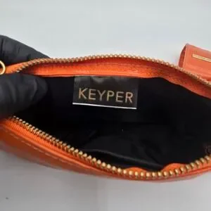 Capture vibrant energy with this chic Keyper wristlet pouch. Crafted from supple orange faux leather, its textured surface offers a luxurious feel, while the gleaming gold-tone zipper adds a touch of polished sophistication. The integrated wrist strap, complete with a branded metal plate, ensures your essentials are always within easy reach, allowing you to move through your day with effortless style and convenience. Perfect for a night out, a quick errand, or as a stylish organizer within a larger bag.