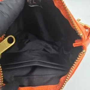 Keywords: orange pouch, faux leather clutch, gold zipper, wristlet bag, cosmetic bag, small purse, travel accessory, evening clutch, designer inspired, bright accessory, modern style, secure closure