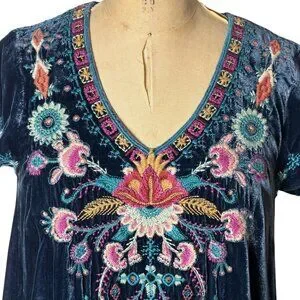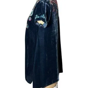 Gorgeous silk blend velvet tunic top with intricate embroiderey on front, back and sleeves. Flattering V neck and high-low cut, with vents on the sides. Beautiful drape. Made by Johnny Was Los Angeles. Size S. Pre-owned, excellent condition.