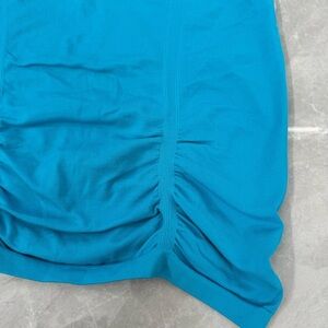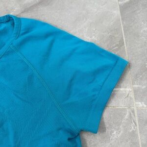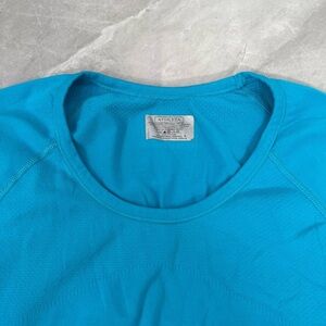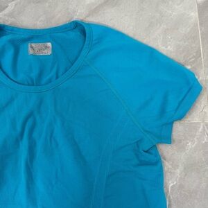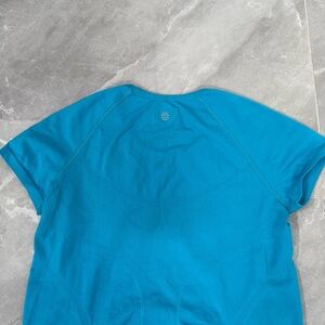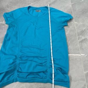 Good condition - Women’s Athleta Fastest Track Tee Short Sleeve Workout Athletic Top. Has ruching on the bottom and grip in the hem. Color: blue. Size: L.