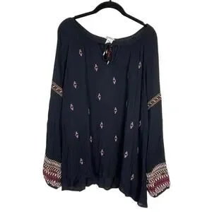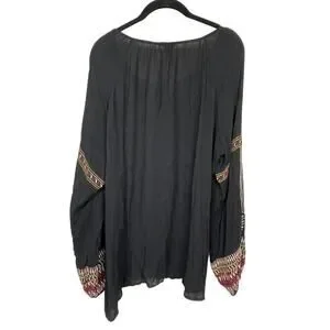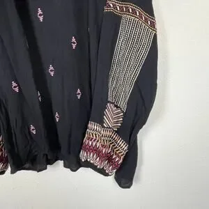 SUNDANCE Women’s Black Embroidered Geometric Peasant Tassel Blouse Boho Size L