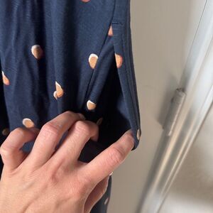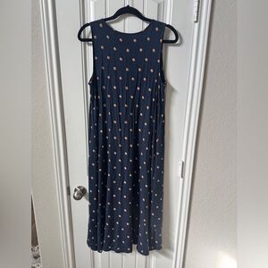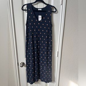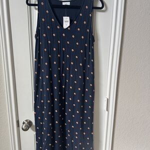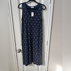 This casual sundress by J. Jill features a flowing maxi silhouette in a charming blue and white polka dot pattern. The sleeveless design and v-neckline offer a breezy, relaxed fit perfect for warm days. Crafted from lightweight fabric, it ensures comfort and style for any casual outing.