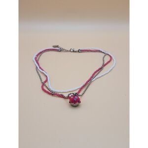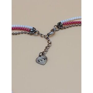 This charming necklace features pink and white beads, complemented by a heart charm. Perfect for adding a playful touch to any outfit.