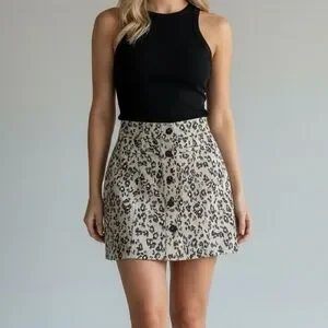 Maurices leopard print button-front mini skirt with a faux suede feel. Features a high-waisted fit, decorative front welt pockets, and a full button-down closure.