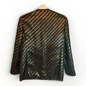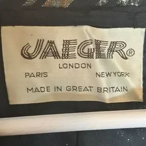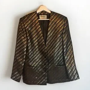 Exceptional vintage Jaeger London blazer, Made in Great Britain, crafted in a striking black fabric with metallic gold-toned pinstripes. This is a beautifully tailored statement piece, ideal as an evening, cocktail, or special-occasion jacket.