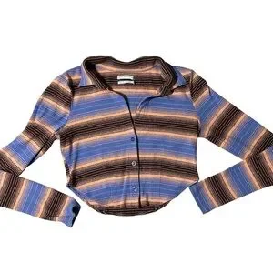 Stylish long sleeve top with vibrant stripes. Features a button-up front. Perfect for casual outings.
