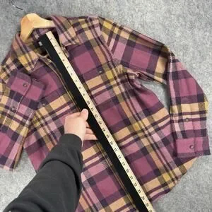 Style: Womens long sleeve flannel shirt with button front and dual chest pockets.