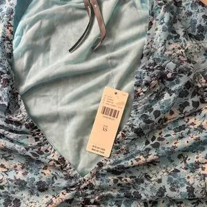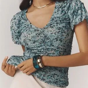 Chic blue floral blouse with a flattering V-neck. Short sleeves and ruched detailing add elegance.