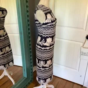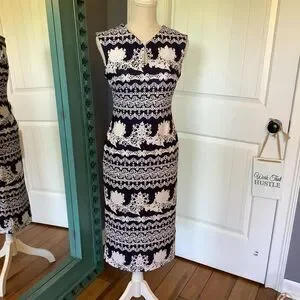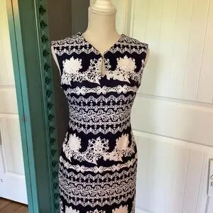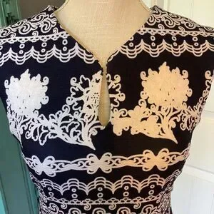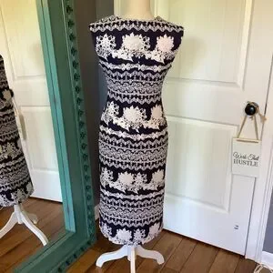 Introducing this stunning navy and white midi dress, perfect for any occasion. This elegant dress features a unique floral pattern and a sophisticated keyhole neckline that adds a touch of charm. With its fitted design, it flatters the silhouette, making it an ideal choice for weddings, brunches, or a day at the office.
