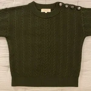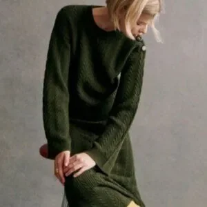 Elegant dark green sweater cardigan. Features button details on shoulder. Cozy and stylish.