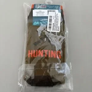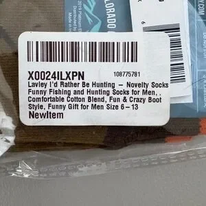 Lavley novelty crew socks feature a playful "I'd Rather Be Hunting" theme, perfect for the outdoorsman in your life. These comfortable cotton blend socks showcase a brown and camo-inspired graphic with bold orange accents and "HUNTING" text on the soles. Designed as a one-size-fits-most option for men's shoe sizes 6-13, they offer a fun and functional boot style with a ribbed cuff for a secure fit. These socks make an excellent gift for hunters, fishers, or anyone who enjoys a bit of humor in their wardrobe.