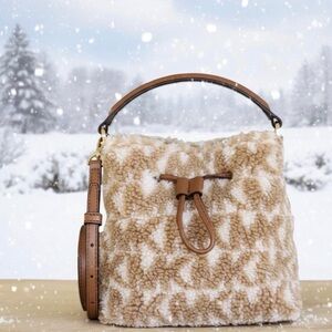 Chic and cozy, this brown and cream shearling bucket bag is perfect for any occasion. Its stylish design and soft texture make it a must-have accessory. This item is a Michael Kors Suri Small Bucket Crossbody Bag, featuring a faux fur shearling body with a logo pattern and leather trim.
