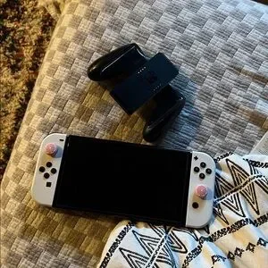 No games but comes with the dock and hdmi to connect to the tv, as well as the power cord. Will be reset to factory settings. Have a glass screen protector (small smudges on screen will be cleaned prior to shipping) handheld joycon holder has scratches but doesn’t affect the use of the handle. Left joycon slides out of handheld mode easier than it should - could use replaced but still playable. (I’ve been playing it - just slides out of you bump it and does “click” into place anymore) right side works just fine. Great used condition!