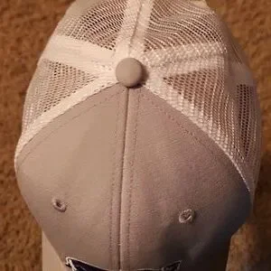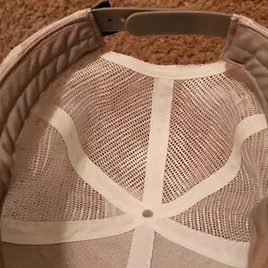 Breathable white mesh cap with adjustable strap. Ideal for outdoor activities.