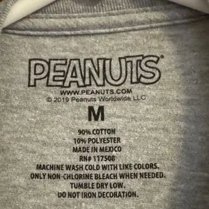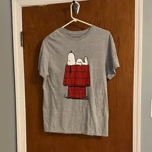 Casual gray t-shirt featuring Snoopy on a red doghouse. Perfect for fans of classic cartoons.