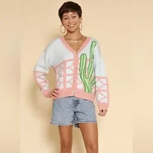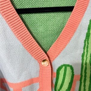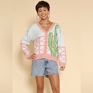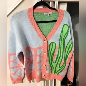 Beautiful brand new cardigan sweater made by Miss sparkling size small. Light blue with cactus print. Soft acrylic blend. Buttons up great quality. Awesome for the spring and on vacation! Slightly oversized it’s bust up to 42 inches. Retails for $50 of upscale boutiques.