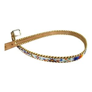 Add a vibrant touch to your outfit with this colorful beaded leather belt. Seed beads with southwest design. No maker marks. The leather is 35” long.